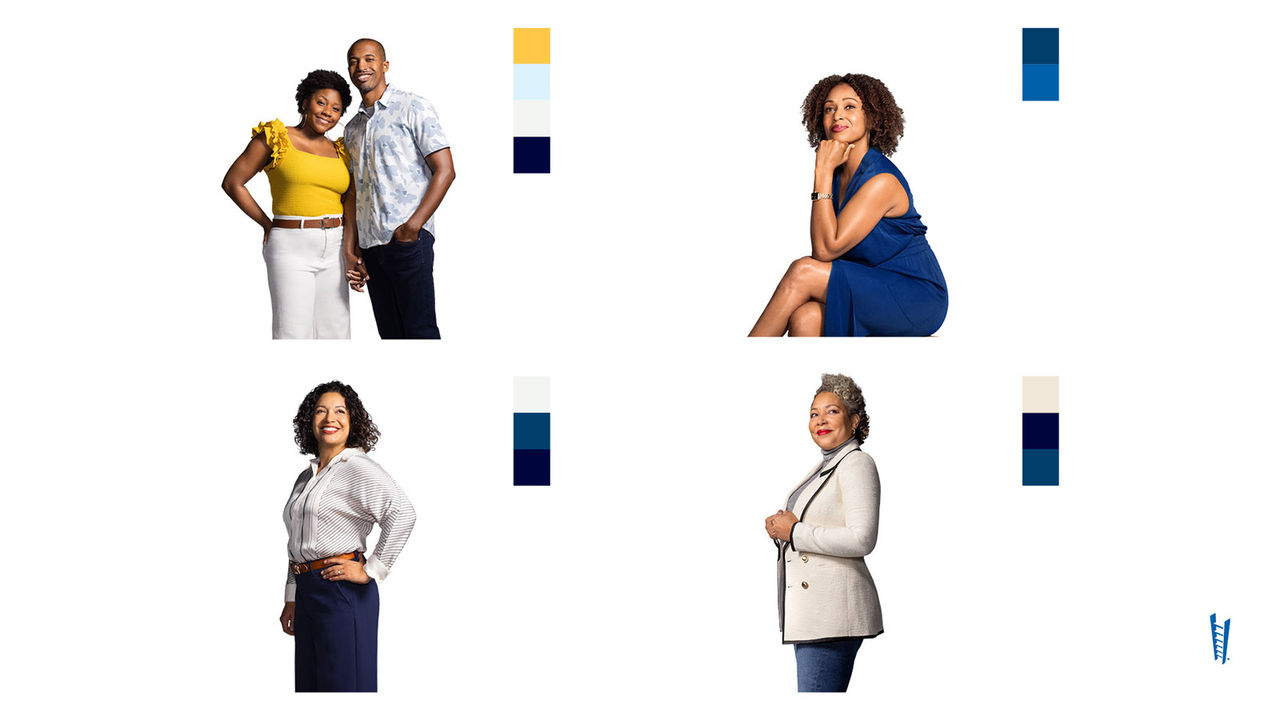 Styling choices for our custom photography are informed by the City National color palette. We can use primary, secondary and accent colors. Below are examples of wardrobe styling with corresponding swatches.